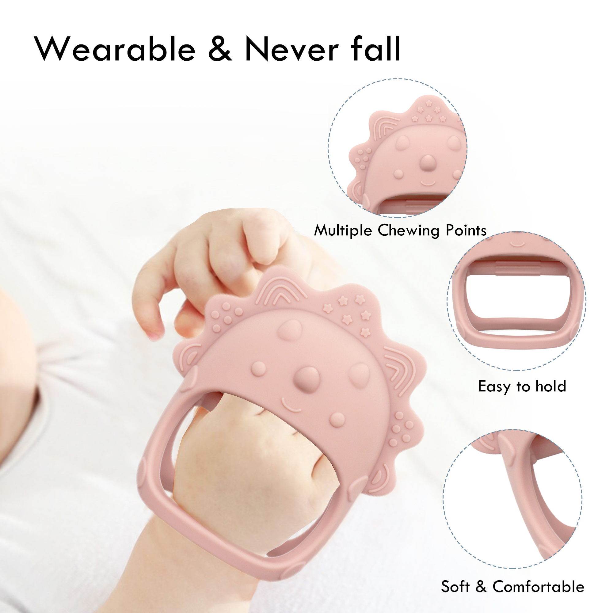 Jucaria este fabricata din silicon alimentar, moale si prietenos pentr gingiile bebelusului. Forma jucariei si texturile pe care le are atat pe fata cat si pe spate maseaza gingiile bebelusului delicat, in perioada eruptiilor dentare, fiind foarte utila pentru calmarea iritatiilor si umflaturilor gingivale.